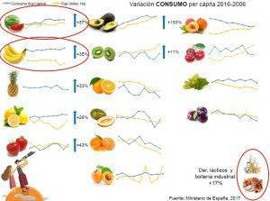 Crecen los consumos por persona y año de aguacate, sandía, plátano, piña y kiwi. Los derivados lácteos y la bollería crecen más que el resto de frutas.