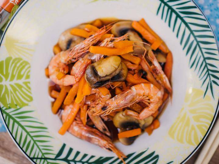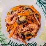 Si utilizas las gambas con cáscara obtendrás mucho más sabor en tu plato. ¡El mar en tu plato!. Si te sobran bastones de zanahoria puedes usarlos para untar en el humus rosa, ¡está riquísimo!